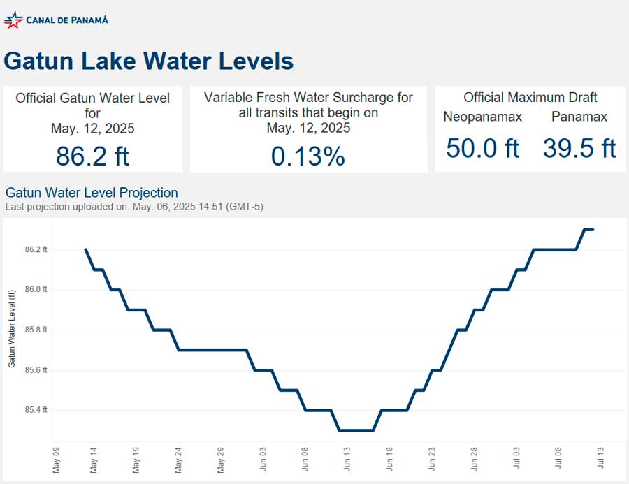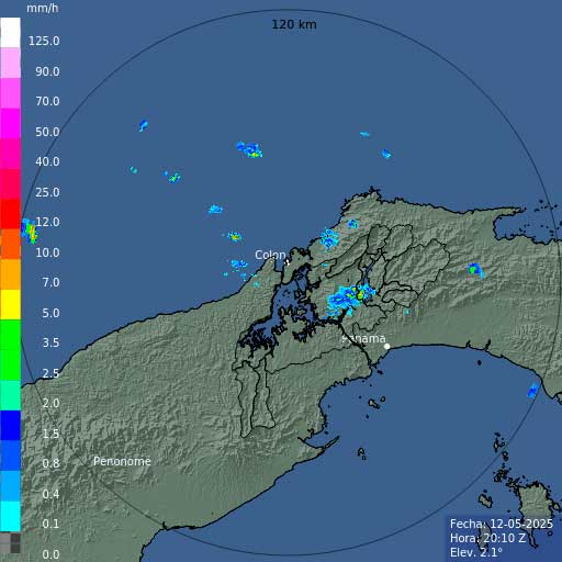 Gráficos de nivel del embalse Gatún para el cargo de agua dulce, radar meteorológico y precipitaciones.