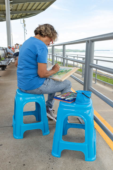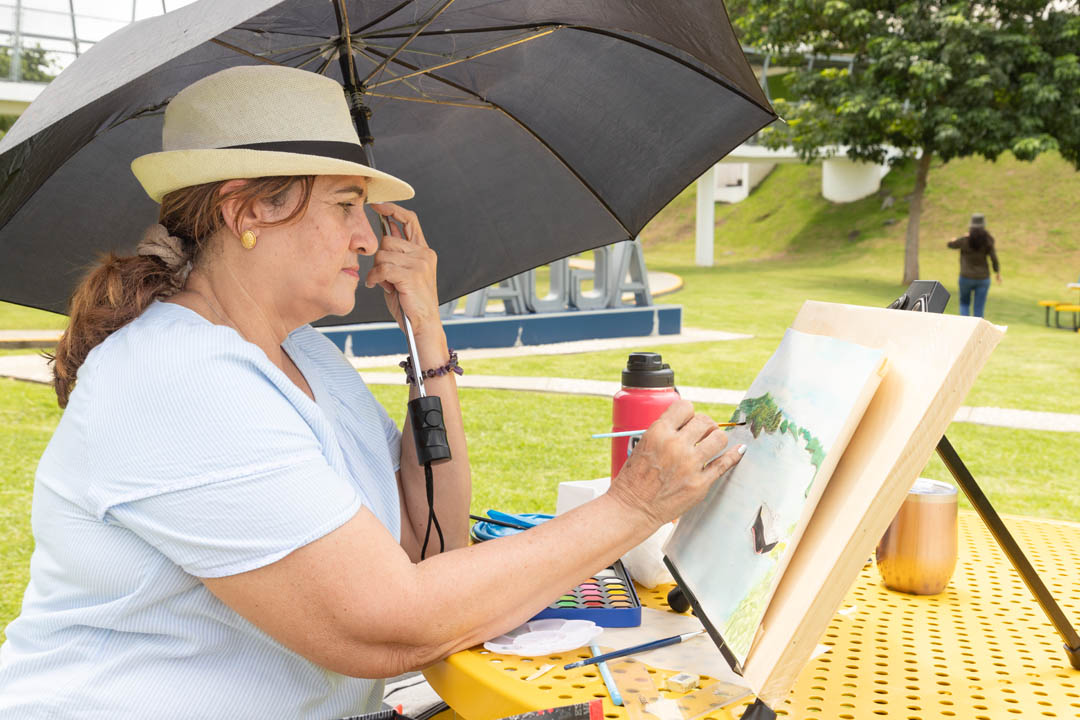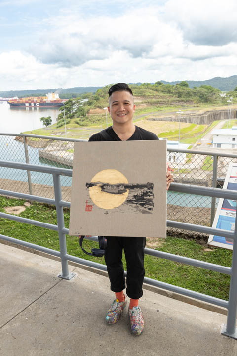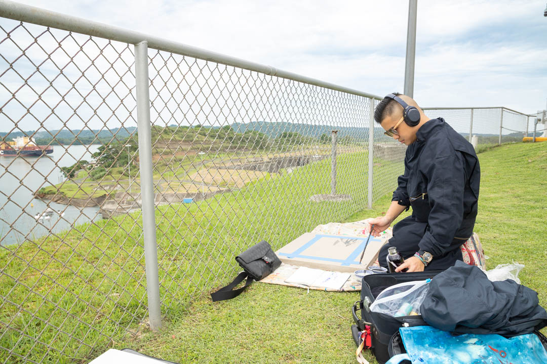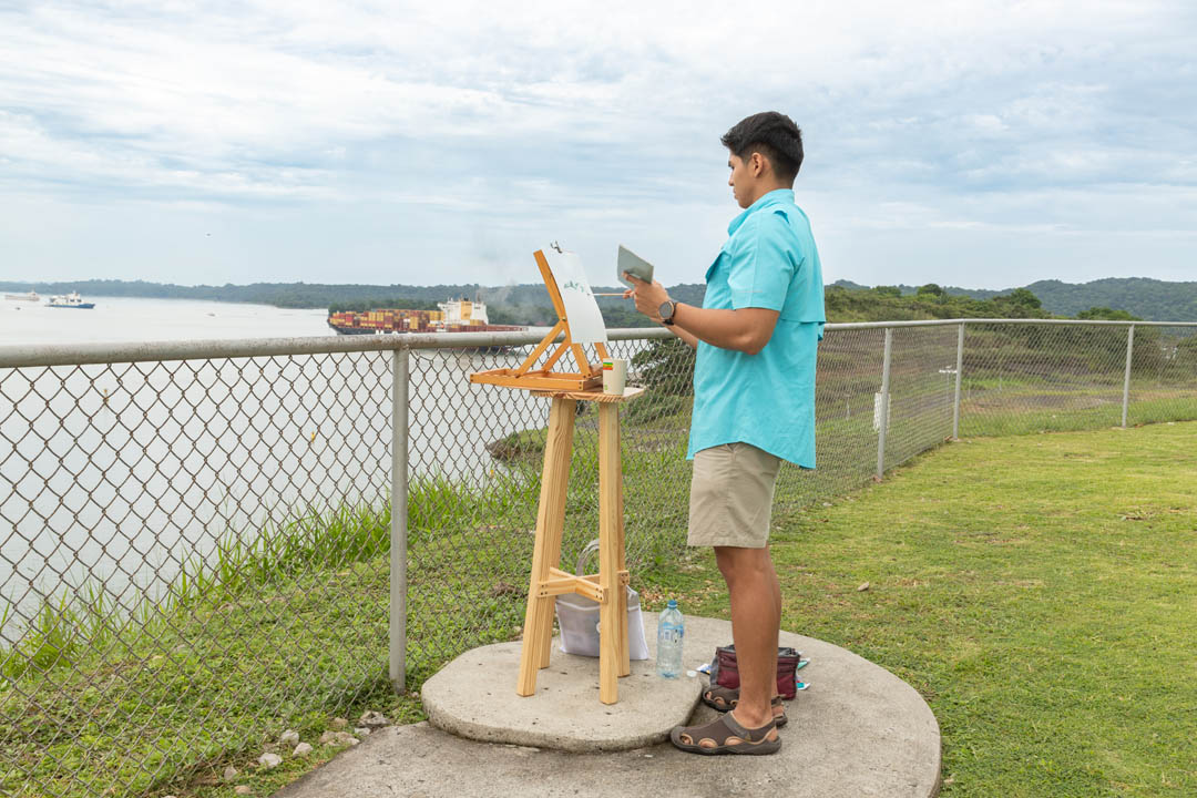 Juan Gabriel Gan, estudiante panameño de artes plásticas de la Universidad Normal de Pekín, acaba de regresar a Panamá luego de 4 años en tierras chinas y es uno de los participantes del evento. Optó por colocar su lienzo de cara al lago Gatún con la idea de reflejar el apacible contraste entre la frondosa naturaleza y los barcos neopanamax que cruzan el Canal. Juan compara las sociedades que le ha tocado vivir en los últimos años y la forma en que el arte es impartido en China al señalarnos que “hay muchísimos jóvenes chinos que desean estudiar arte y las competencias para aplicar a las universidades son muy demandantes. Esto ha causado que muchas de las expresiones artísticas de los estudiantes sean similares. En mi caso, como no pasé por ese entrenamiento, se nota la diferencia. La vibra de mi obra es diferente”. Al conversar con Juan se percibe la dicha que siente al estar en su tierra, y nos comparte que “si bien es cierto ya me acostumbré a vivir en China, Pekín es una ciudad un poco gris. Yo nací aquí, me crie aquí. Eso es lo que pasa en Panamá: te abrazan y te hacen sentir en casa de una vez”.