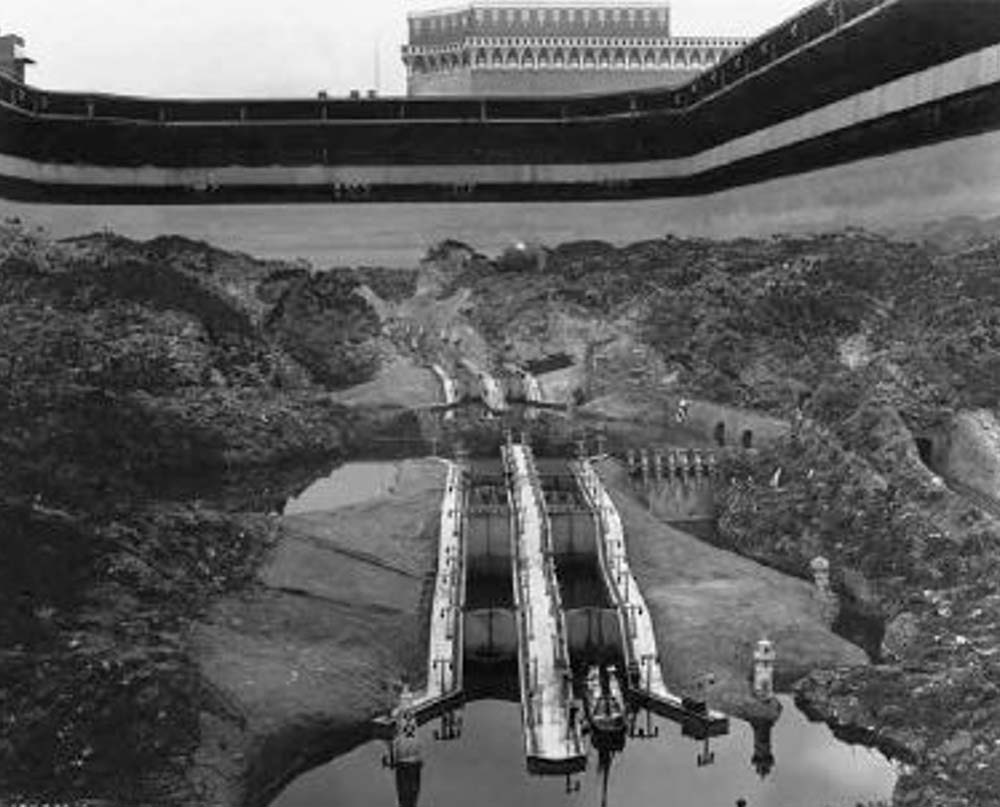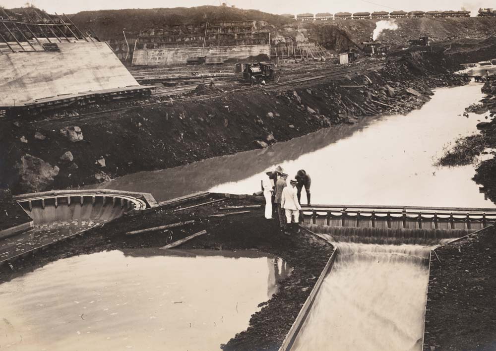 En la fotografía se observa a un grupo de hombres examinando dos modelos experimentales a escala, creados para ayudar a decidir qué tipo de vertedero construir en la represa de Gatún. En su época, la represa de Gatún fue la mayor presa de tierra del mundo: media milla de espesor en la base, una milla y media de longitud en la cresta y 105 pies sobre el nivel del mar. Amplias perforaciones y análisis del suelo indicaban que el terreno carecía de la base sólida que requeriría una presa de mampostería.