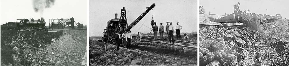 Una vez que el descargador Lidgerwood había removido la tierra y la roca de los vagones planos, el material quedaba acumulado en montículos de aproximadamente 4 pies de altura y 6 pies de ancho a lo largo de las vías, y es aquí donde ingresaba esta máquina de gran productividad el esparcidor de tierra, que mecanizó la distribución del suelo y realizó el trabajo que, de otro modo, habría requerido miles de hombres para reducir aquellas enormes pilas. Remolcado por una locomotora, el esparcidor de tierra avanzaba por la vía con su hoja derecha o izquierda apoyada contra el montículo, extendiéndolo hasta nivelarlo. Las hojas o alas, de 11 ½ pies de longitud, eran colocadas en el ángulo adecuado mediante cilindros neumáticos.