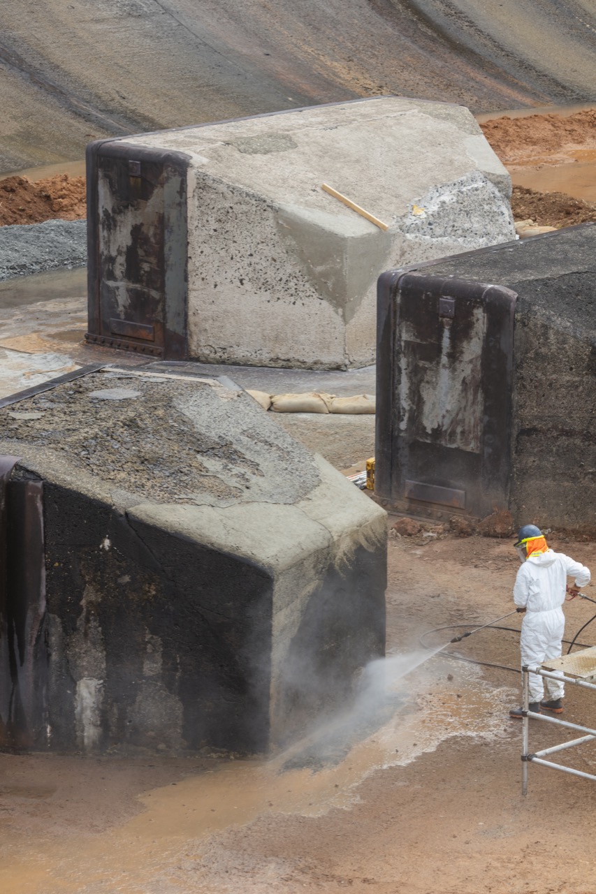 Este mes se dio el arreglo de tres bloques disipadores, los cuales presentaban partes deterioradas en su estructura de concreto. Los trabajos consistieron en demoler el concreto dañado y reparar el mismo, colocando acero de refuerzo, aplicar un puente de adherencia entre el concreto viejo y el nuevo, y restablecer las partes deterioradas con mezcla de concreto de 5,000psi devolviéndolos a su forma original.