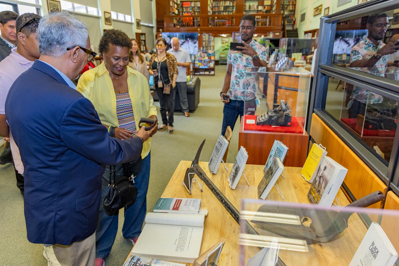 La mandataria pudo admirar en el lobby del edificio 704 obras de arte alusivas a la ampliación del Canal de Panamá. En el segundo piso, en la sala de lectura de la biblioteca, Dame Mason puso apreciar herramientas usadas por los obreros antillanos que construyeron el Canal, así como una rica bibliografía de autores panameños y extranjeros sobre esta parte de la historia.